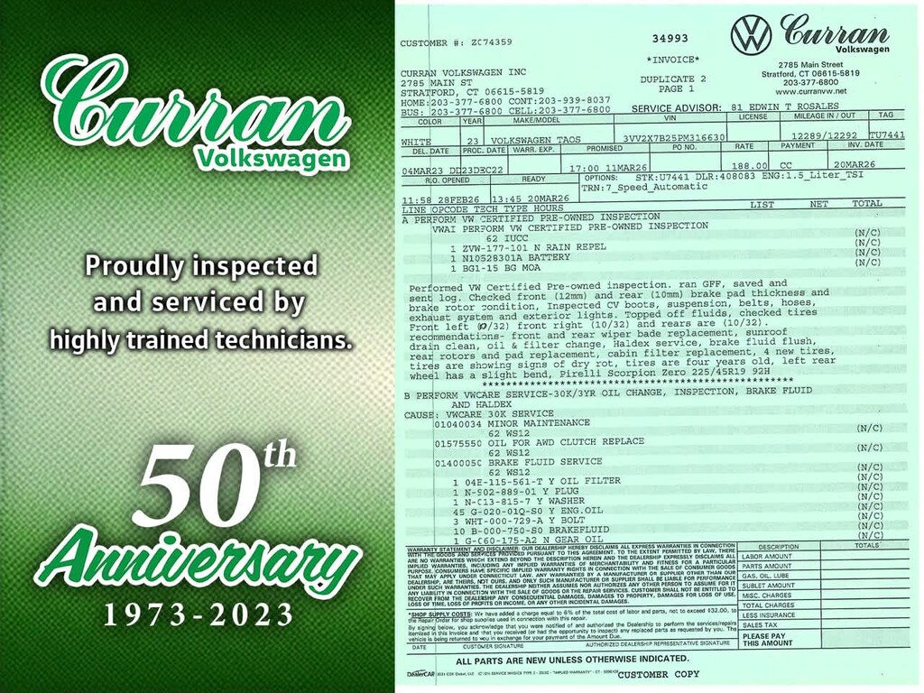 What separates Curran VW inventory from other dealers? All Certified vehicles undergo a thorough CT DMV Safety and 100+ Volkswagen Certified inspection. Every vehicle is fully serviced and brought up to date on maintenance. Unlike other dealers that may do the minimum to retail a vehicle, we go above and beyond, making sure every car is in as good mechanical shape for you as it possibly can be. All reconditioning is documented, and a full repair order on all our vehicles is included.