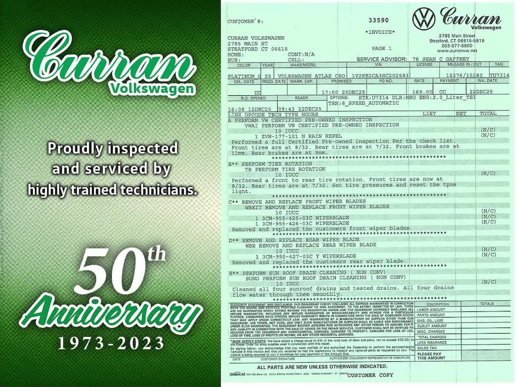 What separates Curran VW inventory from other dealers? All Certified vehicles undergo a thorough CT DMV Safety and 100+ Volkswagen Certified inspection. Every vehicle is fully serviced and brought up to date on maintenance. Unlike other dealers that may do the minimum to retail a vehicle, we go above and beyond, making sure every car is in as good mechanical shape for you as it possibly can be. All reconditioning is documented, and a full repair order on all our vehicles is included.
