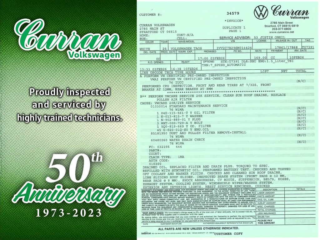 What separates Curran VW inventory from other dealers? All Certified vehicles undergo a thorough CT DMV Safety and 100+ Volkswagen Certified inspection. Every vehicle is fully serviced and brought up to date on maintenance. Unlike other dealers that may do the minimum to retail a vehicle, we go above and beyond, making sure every car is in as good mechanical shape for you as it possibly can be. All reconditioning is documented, and a full repair order on all our vehicles is included.